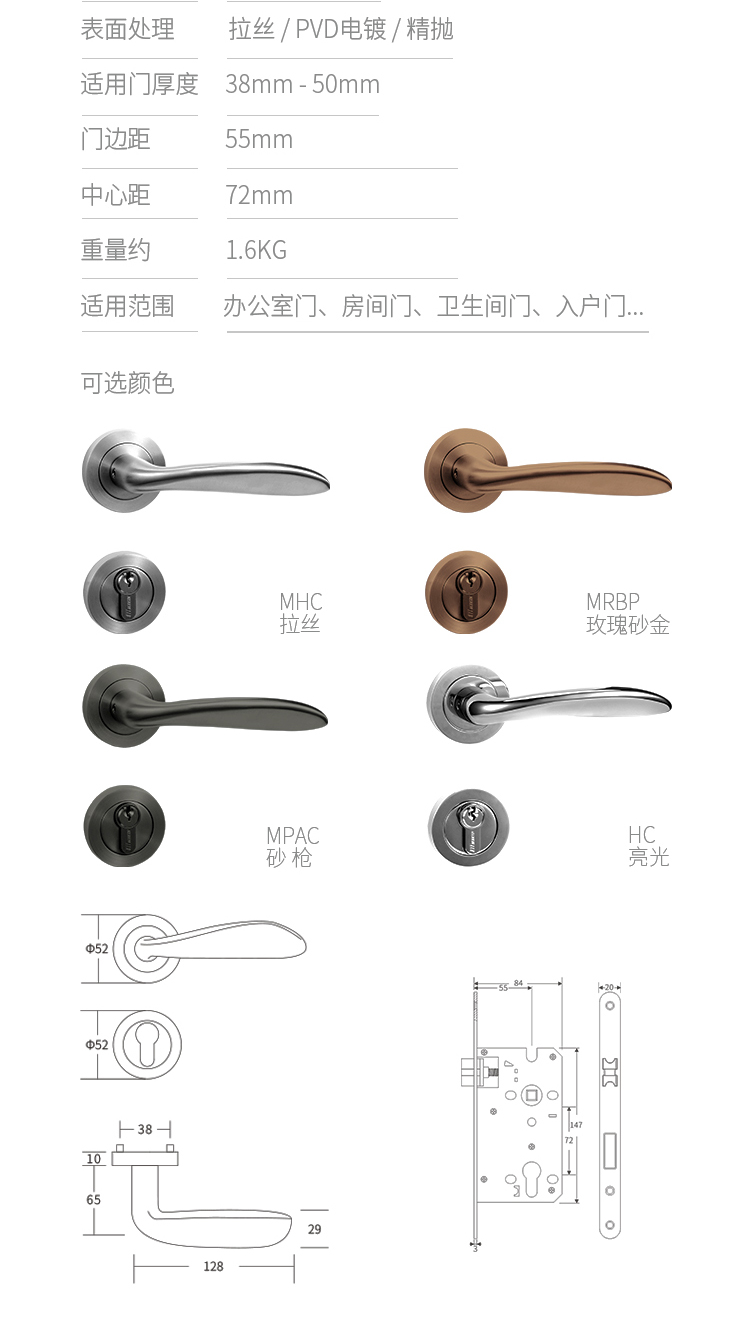 • 产品颜色:拉丝MHC、亮光HC、玫瑰砂金MRBP、砂枪MPAC