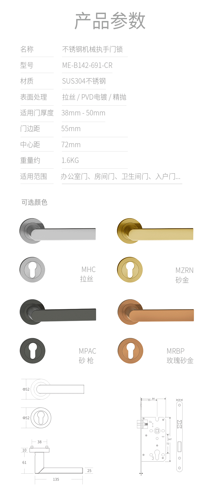 • 产品颜色:拉丝MHC、砂金MZRN、玫瑰砂金MRBP、枪色MPAC