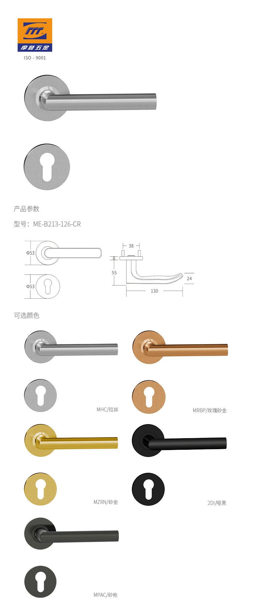 • 产品颜色:MHC/拉丝、MZRN/砂金、MRBP/玫瑰砂金、MPAC/砂金、2DI/哑黑、AB21B/金边黑