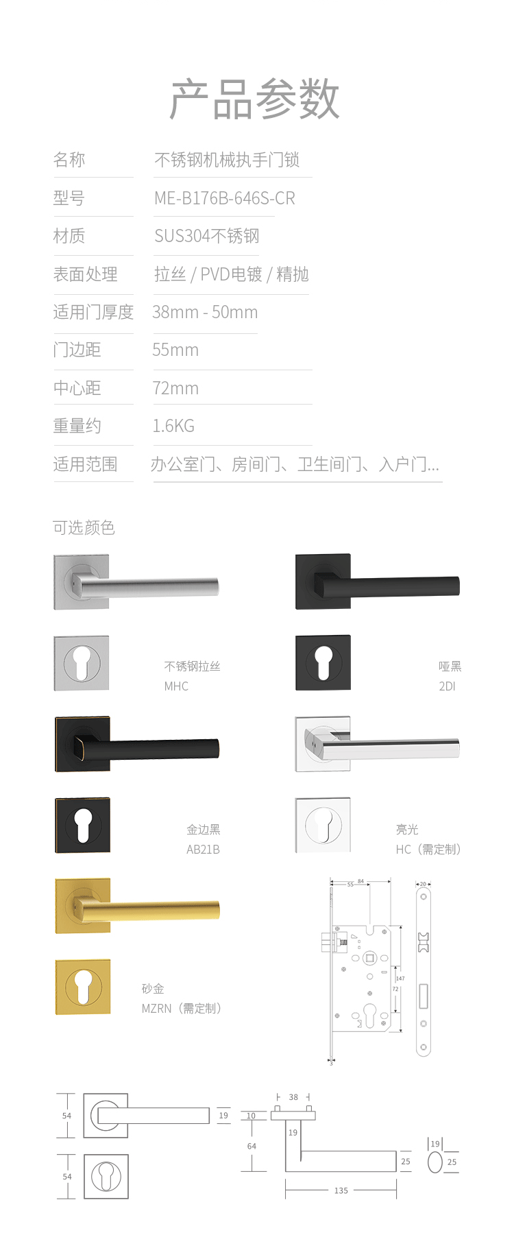 > Mechanical Lever Lockset - Stainless Steel > B176B SERIE-(Sandwich Clip-On Square Rose) > Details